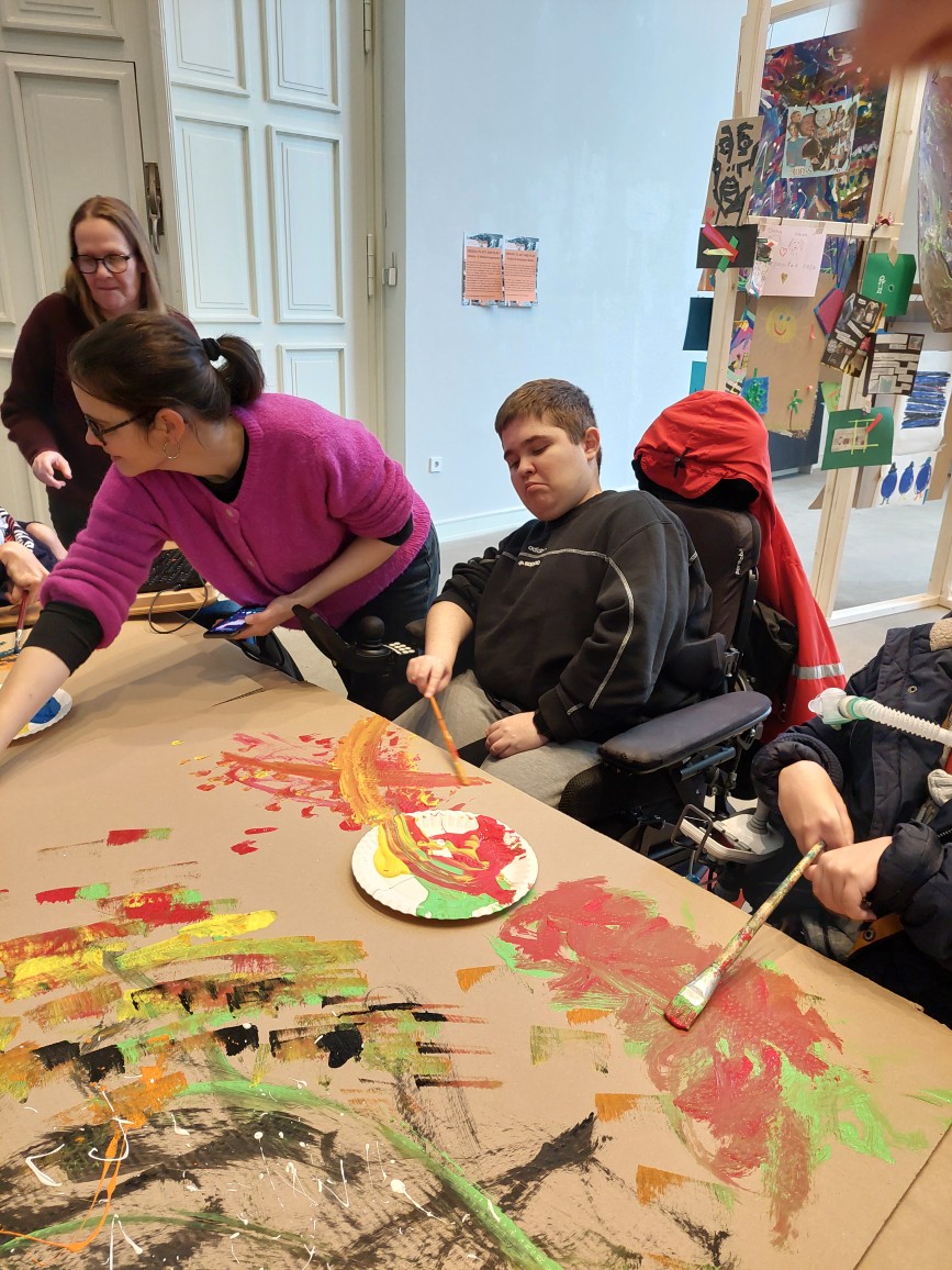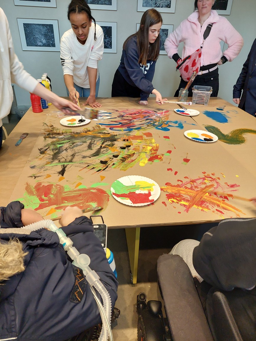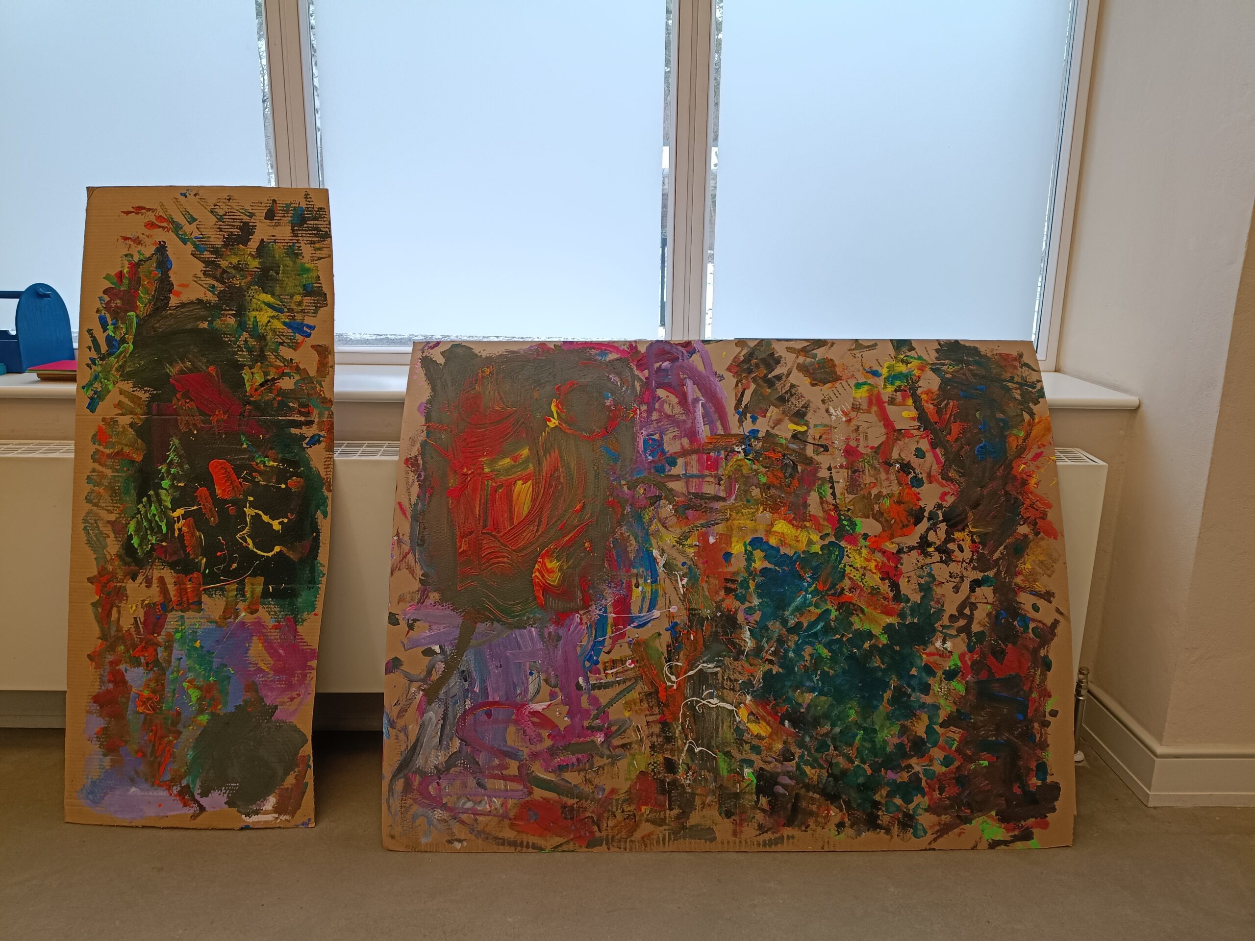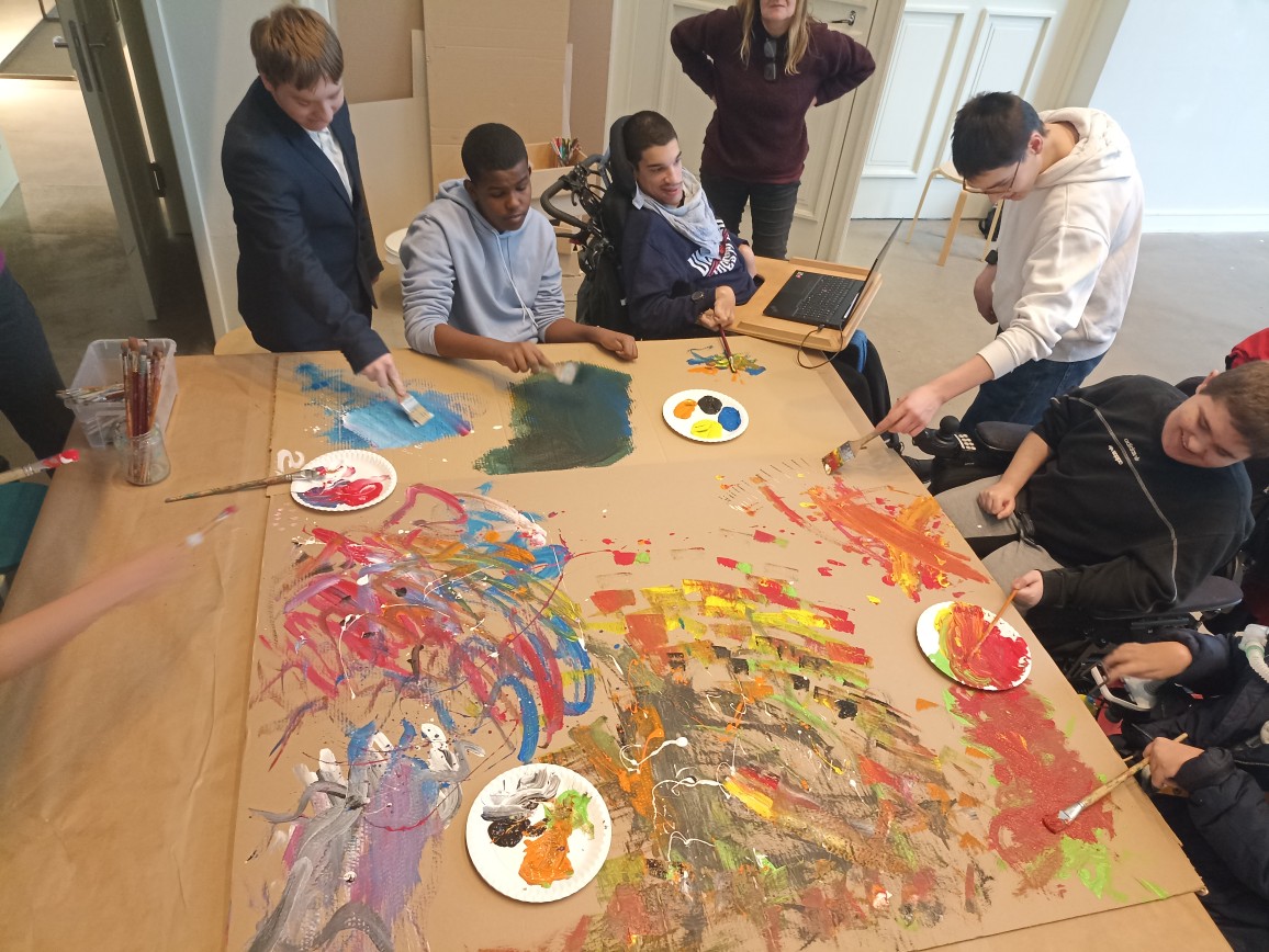 Der Höhepunkt war die praktische Arbeit. Inspiriert von Vedovas Stil arbeiteten wir als ganze Klasse gemeinsam an einem riesigen Werk aus großformatigen Pappen. Zu lauter Musik malten wir „wild“ und intuitiv. Es ging nicht um Perfektion, sondern um den Ausdruck im Moment. Dass wir alle gleichzeitig an einer Fläche arbeiteten, war eine besondere Erfahrung – am Ende entstand ein komplexes Gemeinschaftswerk, das die Energie unserer Gruppe widerspiegelte.